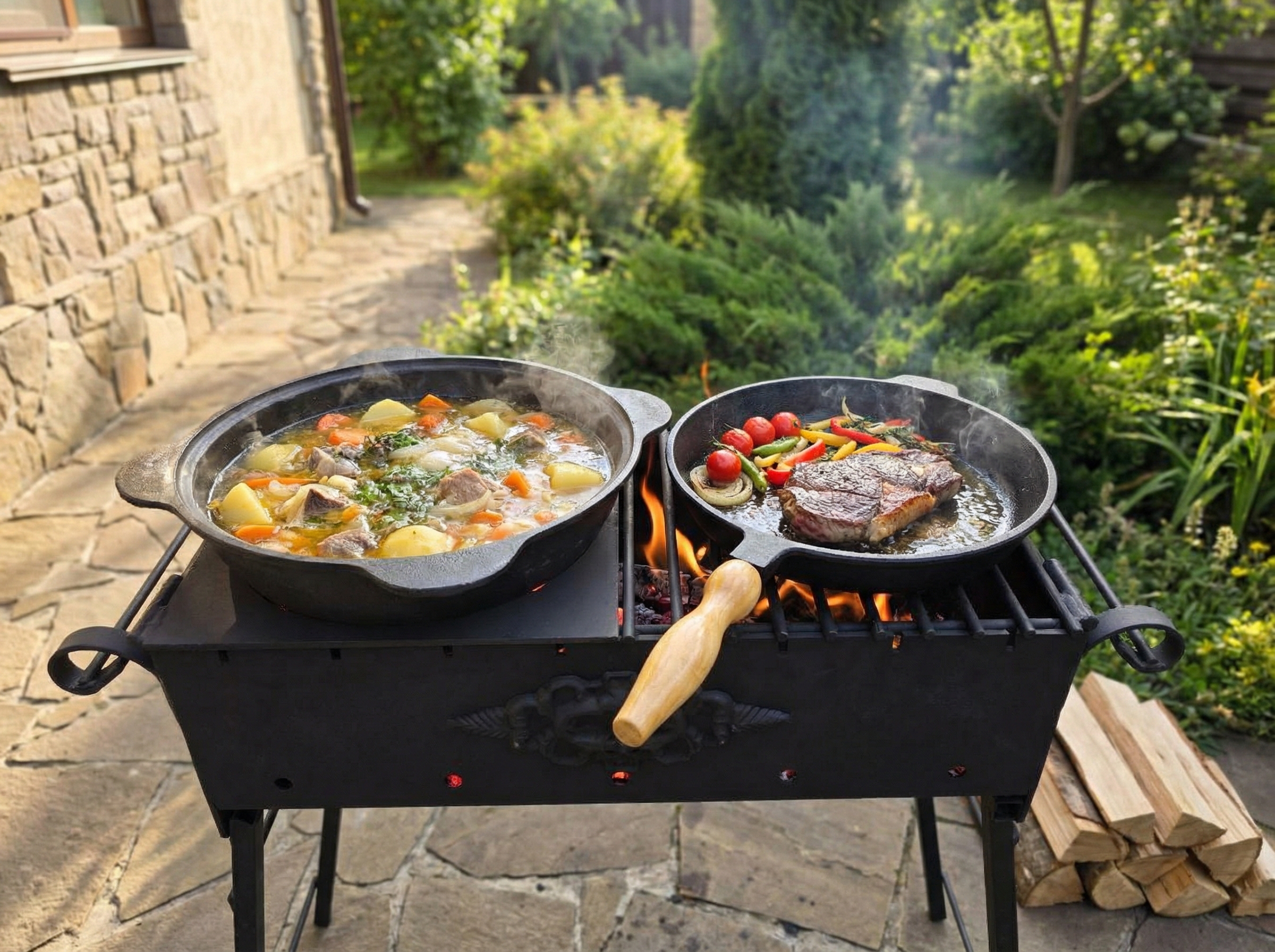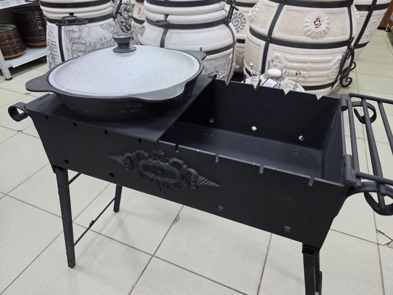 - **Откидная решётка / откидное место под казан** — можно готовить **в казане**, в том числе использовать **афганский казан** (и при необходимости ставить посуду/сковороду).