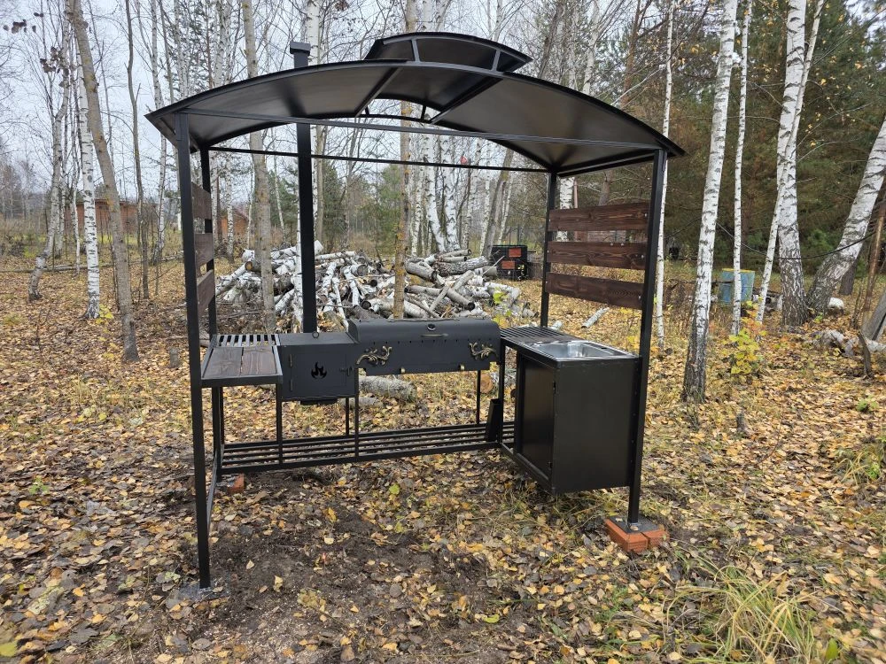 Зона разборная: отдельно идут крыша, стойки, дровница, мангал, печь, труба. Фиксация — болтовые соединения (удобно для перевозки и установки).
